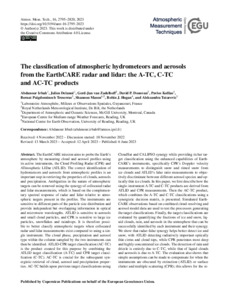 Irbah, A. ORCID: https://orcid.org/0000-0003-3265-3148, Delanoë, J., van Zadelhoff, G.-J. ORCID: https://orcid.org/0000-0002-1974-1998, Donovan, D. P., Kollias, P., Puigdomènech Treserras, B., Mason, S. ORCID: https://orcid.org/0000-0002-9699-8850, Hogan, R. J. ORCID: https://orcid.org/0000-0002-3180-5157 and Tatarevic, A. (2023) The classification of atmospheric hydrometeors and aerosols from the EarthCARE radar and lidar: the A-TC, C-TC and AC-TC products. Atmospheric Measurement Techniques, 16 (11). pp. 2795-2820. ISSN 1867-8548 doi: 10.5194/amt-16-2795-2023