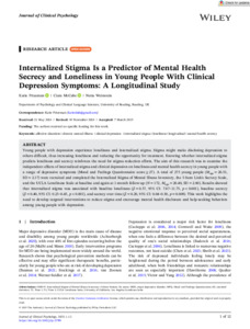 Prizeman, K., McCabe, C. ORCID: https://orcid.org/0000-0001-8704-3473 and Weinstein, N. ORCID: https://orcid.org/0000-0003-2200-6617 (2025) Internalized stigma is a predictor of mental health secrecy and loneliness in young people with clinical depression symptoms: a longitudinal study. Journal of Clinical Psychology, 81 (7). pp. 545-556. ISSN 1097-4679 doi: 10.1002/jclp.23789
