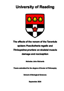 Richards, N. J. (2025) The effects of the venom of the Tarantula spiders Poecilotheria regalis and Thrixopelma pruriens on skeletal muscle damage and nociception. PhD thesis, University of Reading. doi: 10.48683/1926.00121915
