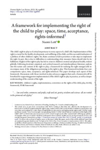 The child’s right to play is of critical importance to every aspect of a child’s life. Implementation of this right is crucial for the health, development, and wellbeing of the child, and the successful realization of a plethora of other children’s rights. Yet, States continue to fail to prioritize or take steps to implement the right. In part, this is due to difficulties in understanding what measures States should take for its fulfilment. Neglect of the right to play has led to crises in children’s mental and physical health, evident globally. Following doctrinal, empirical, and archival research and interdisciplinary literature analysis into the nature and content of the right to play, a framework for realizing the right emerged able to encompass many of the obligations pertaining to the right to play. This framework includes four core components: space, time, acceptance, and rights-informed. The paper develops each aspect of this framework. Discussions with those involved in play advocacy suggests that such a framework will be beneficial for supporting greater implementation of the child’s right to play in practice, as well as deeper understanding of the content of the right.