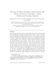 Hybrid clouds offer more capacity and flexibility than public or private clouds alone, making them popular in business settings. However, they also complicate the scheduling of workflow applications due to their complex computing resources. Furthermore, significant concerns about exposing sensitive data on public clouds and securing data transmission add additional challenges to the scheduling process. Although various workflow scheduling strategies for hybrid clouds that address privacy and security concerns have been proposed, they have inherent limitations. Many of these methods, including heuristic and metaheuristic approaches, are tailored for batch processing and are not suitable for real-time scenarios where workflows can arrive unpredictably. Additionally, they often prioritize security over reducing execution time and costs, compromising overall efficiency. To tackle these challenges, we introduce a scheduling system in Hybrid clOuds that considers Privacy and Security constraints, called HOPS. HOPS utilizes Deep Reinforcement Learning to dynamically assign workflows to virtual machines in real-time, and aims to minimize both makespan and operational costs while adhering to privacy and security standards. We provide a comprehensive overview of the design of HOPS, and our experimental results clearly show its advantages over existing methods in terms of makespan, cost efficiency, and the success rate, with privacy and security compliance.