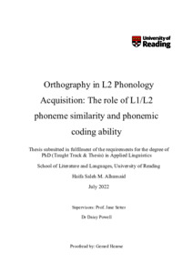 Alhumaid, H. S. M. (2023) Orthography in L2 phonology acquisition: the role of L1/L2 phoneme similarity and phonemic coding ability. PhD thesis, University of Reading. doi: 10.48683/1926.00122116