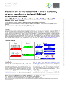 McGuffin, L. J. ORCID: https://orcid.org/0000-0003-4501-4767, Alhaddad, S. N., Behzadi, B., Edmunds, N. S., Genc, A. G. and Adiyaman, R. (2025) Prediction and quality assessment of protein quaternary structure models using the MultiFOLD2 and ModFOLDdock2 servers. Nucleic Acids Research, 53 (W1). W472-W477. ISSN 0305-1048 doi: 10.1093/nar/gkaf336