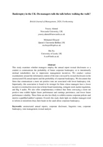 Ahmed, Y. ORCID: https://orcid.org/0000-0001-7022-0912, Elsayed, M. ORCID: https://orcid.org/0000-0002-6834-2088 and Xu, B. ORCID: https://orcid.org/0000-0003-3512-5834 (2024) Bankruptcy in the UK: do managers talk the talk before walking the walk? British Journal of Management, 35 (4). pp. 2011-2031. ISSN 1467-8551 doi: 10.1111/1467-8551.12804