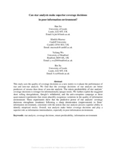This study uses the quality of coverage decisions as a new metric to evaluate the performance of star and non-star analysts. We find that the coverage decisions of star analysts are better predictors of returns than those of non-star analysts. The return predictability of star analysts’ coverage decisions is stronger for informationally opaque stocks. We further exploit the staggered short selling deregulations, Google’s withdrawal, and the anti-corruption campaign as three quasi-natural experiments that create plausibly exogenous variations in the quality of information environment. These experiments show that the predictive power of star analysts’ coverage decisions strengthens (weakens) following a sharp deterioration (improvement) in firms’ information environment, consistent with the notion that star analysts possess superior ability to identify mispriced stocks. Overall, star analysts make better coverage decisions and play a superior role as information intermediaries, especially in poor information environment.