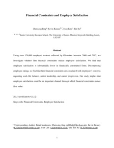 Using over 120,000 employee reviews collected by Glassdoor between 2008 and 2015, we investigate whether firm financial constraints reduce employee satisfaction. We find that employee satisfaction is substantially lower in financially constrained firms. Decomposing employee ratings, we find that firm financial constraints are associated with employees’ concerns regarding work-life balance, senior leadership, and career progression. Our study implies that employee satisfaction could be an important channel through which financial constraints reduce firm value.
