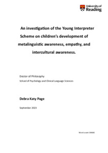 Page, D. K. ORCID: https://orcid.org/0009-0004-6790-2516 (2024) An investigation of the Young Interpreter Scheme on children’s development of metalinguistic awareness, empathy, and intercultural awareness. PhD thesis, University of Reading. doi: 10.48683/1926.00122854