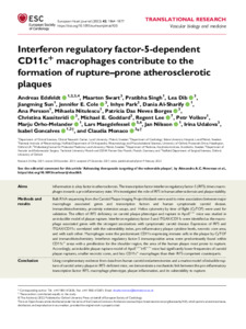 Interferon regulatory factor-5-dependent CD11c+ macrophages contribute to the formation of rupture–prone atherosclerotic plaques.