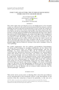 This article argues that vast histories of war and displacement in the twentieth century are connected to the small and almost unnoticeable lives of insects, and that philology has much to gain from paying attention to insect worlds. We examine two case studies: the work of the German entomologist Otto Hecht and his wife, Rose Caro Hecht, and the lay entomology of the German writer Hanns Heinz Ewers and his letter exchange with geneticist Richard B. Goldschmidt. Drawing on the cultural‐theoretical work of Walter Benjamin, our analysis sheds light on the entanglement of entomological and philological labour and a recurrent interplay of intimacy and violence in both. We develop an approach which takes seriously the eros of intellectual pursuits and the endless curiosity that drives the study of words and insects, but which also shows how these encounters with the very small intersect with incomprehensibly large‐scale political violence in the twentieth century. We playfully suggest that the method we develop in this article constitutes a form of ‘insect philology’.