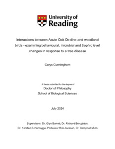 Cunningham, C. (2025) Interactions between Acute Oak Decline and woodland birds - examining behavioural, microbial and trophic level changes in response to a tree disease. PhD thesis, University of Reading. doi: 10.48683/1926.00123366