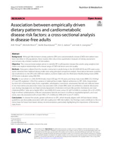 Yilmaz, A., Weech, M. ORCID: https://orcid.org/0000-0003-1738-877X, Bountziouka, V., Jackson, K. G. ORCID: https://orcid.org/0000-0002-0070-3203 and Lovegrove, J. A. ORCID: https://orcid.org/0000-0001-7633-9455 (2025) Association between empirically driven dietary patterns and cardiometabolic disease risk factors: a cross-sectional analysis in disease-free adults. Nutrition & Metabolism, 22. 73. ISSN 1743-7075 doi: 10.1186/s12986-025-00965-6