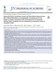 Wong, G., Clegg, M. E., Ross, D., Lovegrove, J. A. ORCID: https://orcid.org/0000-0001-7633-9455 and Jackson, K. G. ORCID: https://orcid.org/0000-0002-0070-3203 (2025) Sequential meals containing animal and plant based saturated fats have differential effects on postprandial gut hormones but no impact on satiety compared with unsaturated fats in generally healthy men: findings from the randomized controlled crossover CocoHeart study. Journal of Nutrition, 155 (9). pp. 3020-3029. ISSN 1541-6100 doi: 10.1016/j.tjnut.2025.06.027