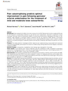 Harrison, R. ORCID: https://orcid.org/0000-0003-3674-9622, Salomons, T. V., MacGill, S. and Little, M. W. (2025) Pain catastrophising predicts optimal improvement in pain following genicular arterial embolisation for the treatment of mild and moderate knee osteoarthritis. British Journal of Pain. ISSN 2049-4637 doi: 10.1177/20494637251358334