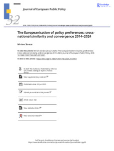 Sorace, M. ORCID: https://orcid.org/0000-0003-3779-1988 (2025) The Europeanisation of policy preferences: cross-national similarity and convergence 2014–2024. Journal of European Public Policy. ISSN 1466-4429 doi: 10.1080/13501763.2025.2512901