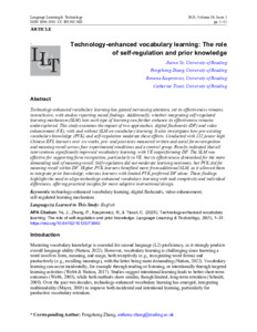 Ye, J., Zhang, P. ORCID: https://orcid.org/0000-0002-2136-4984, Kasprowicz, R. ORCID: https://orcid.org/0000-0001-9248-6834 and Tissot, C. ORCID: https://orcid.org/0000-0001-9835-0903 (2025) Technology-enhanced vocabulary learning: the role of self-regulation and prior knowledge. Language Learning & Technology, 29 (1). pp. 1-31. ISSN 1094-3501 doi: 10.64152/10125/73640