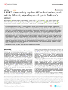 LRRK2 kinase activity regulates GCase level and enzymatic activity differently depending on cell type in Parkinson’s disease.