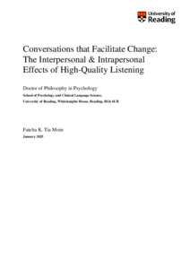 Moin, F. K. T. (2025) Conversations that facilitate change: the interpersonal & intrapersonal effects of high-quality listening. PhD thesis, University of Reading. doi: 10.48683/1926.00123657