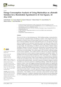 Bande, L., Ahmad, A., Al Mansoori, S., Ahmed, W., Shibeika, A., Anbrine, S. and Rauf, A. (2025) Energy consumption analysis of using mashrabiya as a retrofit solution for a residential apartment in Al Ain Square, Al Ain, UAE. Buildings, 15 (4). 2532. ISSN 2075-5309 doi: 10.3390/buildings15142532