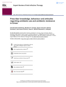 Al-Hashimy, Z. S., Conway, B. R., Al-Azzam, S., Karasnehe, R., Al Harth, S. S., Bond, S. E. and Aldeyab, M. A. (2025) Prescriber knowledge, behaviour and attitudes regarding antibiotic use and antibiotic resistance in Oman. Expert Review of Anti-infective Therapy, 23 (9). pp. 843-852. ISSN 1744-8336 doi: 10.1080/14787210.2025.2538613