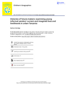 Although the opportunities and challenges of the informal sector have received much attention in recent decades, understanding how the characteristics of informal work intersect with and shape youths’ imagined futures remains understudied. Addressing this gap is crucial, given region-specific increases in the number of youth entering the urban informal sector, particularly across sub-Saharan Africa. This paper focuses on in-depth ethnographic research undertaken in Arusha and Dar es Salaam, Tanzania, with 22 young informal vendors aged 15–35. Life-mapping interviews and participatory timeline diagrams were used to develop rich insights into participants’ past, present and imagined lives and livelihoods. It extends the concept of ‘being and becoming’, developed to examine the interwoven nature of youths’ present and future lives, by analysing how young vendors navigate the intersection of their past experiences, present realities, and future possibilities through informal work in urban spaces. The article highlights the complex temporality of youths’ informal livelihoods by exploring their goals and ambitions, income generating activities, experiences of customer-related challenges, and perspectives on self-employment. Through this, it argues that youths’ histories shape their futures as much as the unfolding of their lives in the present. It also positions young vendors as future-makers who actively construct their futures through informal work. In the context of growing socio-economic uncertainty, this paper provides a timely contribution to geographical perspectives on youth by examining how young vendors navigate, sustain, adapt, and reimagine their lives and livelihoods within increasingly uncertain urban contexts marked by high levels of informality.