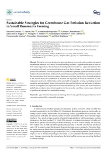 During the previous decades, the growing demand for animal origin products has gained considerable attention. As a result, livestock breeding has faced a rapid intensification in order to fulfil market expectations. This increase in livestock production has led to a large scale of manure that is associated with many environmental impacts, such as climate change, to an increase of greenhouse gases (GHG) emissions. Livestock production is considered to generate significant amounts of GHG, mainly carbon dioxide (CO2), methane (CH4) and nitrous oxide (N2O). Methane and nitrous oxide are the main emissions from livestock systems. Ruminants contribute highly to total livestock emissions. In the present study, the contribution of livestock and especially of the small ruminants in GHG emissions is reviewed. Additionally, useful sustainable strategies for farming and feeding of small ruminants are highlighted. Some of the practices discussed include but are not limited to efficient manure management, the replacement of mineral fertilizers by farm manure, the improvement of feed efficiency and provision of feed supplements. Moreover, the use of food waste or agro-industrial by-products is discussed as a sustainable strategy.
