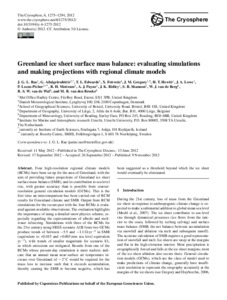 Rae, J. G. L., Aðalgeirsdóttir, G., Edwards, T. L., Fettweis, X., Gregory, J. M. ORCID: https://orcid.org/0000-0003-1296-8644, Hewitt, H. T., Lowe, J. A., Lucas-Picher, P., Mottram, R. H., Payne, A. J., Ridley, J. K., Shannon, S. R. ORCID: https://orcid.org/0000-0002-7644-2724, van de Berg, W. J., van de Wal, R. S. W. and van den Broeke, M. R. (2012) Greenland ice sheet surface mass balance: evaluating simulations and making projections with regional climate models. The Cryosphere, 6 (6). pp. 1275-1294. ISSN 1994-0424 doi: 10.5194/tc-6-1275-2012