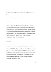 This article outlines some of the key issues involved in developing a programme of strategy training for learners of French, in listening and in writing. It highlights the theoretical perspectives and research findings on listening and writing that informed the selection of strategies to teach learners and thence the development of appropriate materials. Examples of these materials are given as well as advice regarding their use. The article concludes with suggestions for how strategy training might be incorporated into teachers' own work with learners.