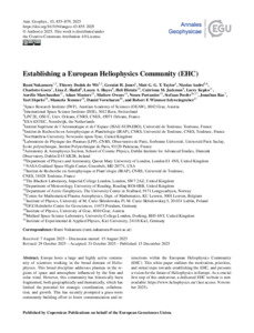 Nakamura, R. ORCID: https://orcid.org/0000-0002-2620-9211, Dudok de Wit, T., Jones, G. H. ORCID: https://orcid.org/0000-0002-5859-1136, Taylor, M. G. G. T. ORCID: https://orcid.org/0000-0002-4206-0250, André, N., Goetz, C. ORCID: https://orcid.org/0000-0003-4468-0338, Hadid, L. Z. ORCID: https://orcid.org/0000-0002-8587-0202, Hayes, L. A., Hietala, H. ORCID: https://orcid.org/0000-0002-3039-1255, Jackman, C. M., Kepko, L. ORCID: https://orcid.org/0000-0002-4911-8208, Marchaudon, A. ORCID: https://orcid.org/0000-0002-1625-3462, Masters, A., Owens, M. ORCID: https://orcid.org/0000-0003-2061-2453, Partamies, N., Poedts, S. ORCID: https://orcid.org/0000-0002-1743-0651, Rae, J. ORCID: https://orcid.org/0000-0002-2637-4786, Shprits, Y. ORCID: https://orcid.org/0000-0002-9625-0834, Temmer, M. ORCID: https://orcid.org/0000-0003-4867-7558, Verscharen, D. ORCID: https://orcid.org/0000-0002-0497-1096 and Wimmer-Schweingruber, R. F. ORCID: https://orcid.org/0000-0002-7388-173X (2025) Establishing a European Heliophysics Community (EHC). Annales Geophysicae, 43 (2). pp. 855-879. ISSN 0992-7689 doi: 10.5194/angeo-43-855-2025