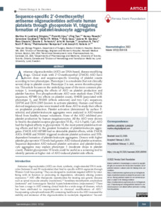 Slingsby, M. H. L., Vijey, P., Tsai, I.-T., Roweth, H. ORCID: https://orcid.org/0000-0002-1100-8409, Couldwell, G., Wilkie, A. R., Gaus, H., Goolsby, J. M., Okazaki, R., Terkovich, B. E., Semple, J. W., Thon, J. N. ORCID: https://orcid.org/0000-0002-7969-7001, Henry, S. P. ORCID: https://orcid.org/0000-0001-5817-0369, Narayanan, P. and Italiano, J. E. J. (2022) Sequence-specific 2'-O-methoxyethyl antisense oligonucleotides activate human platelets through glycoprotein VI, triggering formation of platelet-leukocyte aggregates. Haematologica, 107 (22). pp. 519-531. ISSN 1592-8721 doi: 10.3324/haematol.2020.260059