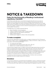 CentAUR (2009) Notice and Takedown Policy for the University of Reading's institutional repository, CentAUR. [CentAUR Administrative Document] (Unpublished)