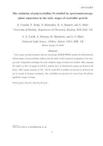 Low-energy and photoemission electron microscopy enables the determination of facet planes of polycrystalline surfaces and the study of their chemical composition at the sub-m scale. Using these techniques the early oxidation stages of nickel were studied. After exposing the surface to 20 L of oxygen at 373 K a uniform layer of chemisorbed oxygen was found on all facets. After oxygen exposure at 473–673 K, small NiO crystallites are formed on all facets but not in the vicinity of all grain boundaries. The crystallites are separated by areas of bare Ni without significant oxygen coverage.
