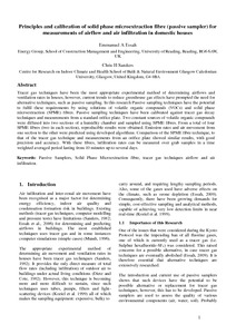 Tracer gas techniques have been the most appropriate experimental method of determining airflows and ventilation rates in houses. However, current trends to reduce greenhouse gas effects have prompted the need for alternative techniques, such as passive sampling. In this research passive sampling techniques have been used to demonstrate the potential to fulfil these requirements by using solutions of volatile organic compounds (VOCs) and solid phase microextraction (SPME) fibres. These passive sampling techniques have been calibrated against tracer gas decay techniques and measurements from a standard orifice plate. Two constant sources of volatile organic compounds were diffused into two sections of a humidity chamber and sampled using SPME fibres. From a total of four SPME fibres (two in each section), reproducible results were obtained. Emission rates and air movement from one section to the other were predicted using developed algorithms. Comparison of the SPME fibre technique with that of the tracer gas technique and measurements from an orifice plate showed similar results with good precision and accuracy. With these fibres, infiltration rates can be measured over grab samples in a time weighted averaged period lasting from 10 minutes up to several days. Key words: passive samplers, solid phase microextraction fibre, tracer gas techniques, airflow, air infiltration, houses.