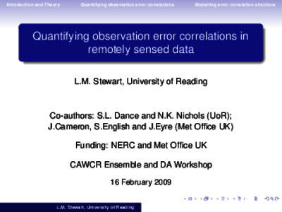 Stewart, L., Cameron, J., Dance, S. L. ORCID: https://orcid.org/0000-0003-1690-3338, English, S., Eyre, J. and Nichols, N. K. ORCID: https://orcid.org/0000-0003-1133-5220 (2009) Quantifying observation error correlations in remotely sensed data. In: Centre for Australian Weather and Climate Research (CAWCR) Workshop on Ensemble Prediction and Data Assimilation, February 2009, Australian Bureau of Meteorology, Melbourne,.
