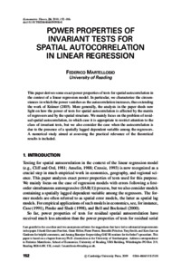 Martellosio, F. (2010) Power properties if invariant tests for spatial autocorrelation in linear regression. Econometric Theory, 26 (1). pp. 152-186. ISSN 1469-4360 doi: 10.1017/S0266466609090641
