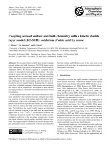Pfrang, C., Shiraiwa, M. and Pöschl, U. (2010) Coupling aerosol surface and bulk chemistry with a kinetic double layer model (K2-SUB): oxidation of oleic acid by ozone. Atmospheric Chemistry and Physics, 10 (10). pp. 4537-4557. ISSN 1680-7316 doi: 10.5194/acp-10-4537-2010