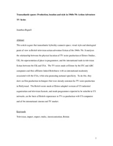 This paper argues that transatlantic hybridity connects space, visual style and ideological point of view in British television action-adventure fiction of the 1960s–1970s. It analyses the relationship between the physical location of TV series production at Elstree Studios, UK, the representation of place in programmes, and the international trade in television fiction between the UK and USA. The TV series made at Elstree by the ITC and ABC companies and their affiliates linked Britishness with an international modernity associated with the USA, while also promoting national specificity. To do this, they drew on film production techniques that were already common for TV series production in Hollywood. The British series made at Elstree adapted versions of US industrial organization and television formats, and made programmes expected to be saleable to US networks, on the basis of British experiences in TV co-production with US companies and of the international cinema and TV market.