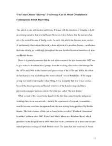Saunders, G. (2010) ‘The great Chinese takeaway’: the strange case of absent Orientalism in contemporary British playwriting. In: Huber, W., Rubik, M. and Novak, J. (eds.) Staging interculturality: contemporary drama in English. Wissenschaftlicher Verlag Trier, Germany, pp. 65-74. ISBN 9783868212327