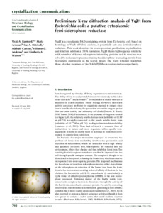 Bamford, V. A., Armour, M., Mitchell, S. A., Cartron, M., Andrews, S. C. ORCID: https://orcid.org/0000-0003-4295-2686 and Watson, K. A. ORCID: https://orcid.org/0000-0002-9987-8539 (2008) Preliminary X-ray diffraction analysis of YqjH from Escherichia coli: a putative cytoplasmic ferri-siderophore reductase. Acta Crystallographica Section F-Structural Biology and Crystallization Communications, 64 (9). pp. 792-796. ISSN 1744-3091 doi: 10.1107/S174430910802352X