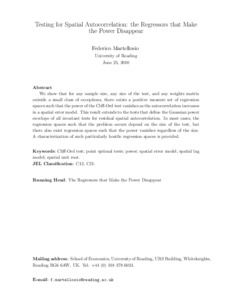 Martellosio, F. (2010) Testing for spatial autocorrelation: the regressors that make the power disappear. Econometric Reviews, 31 (2). pp. 215-240. ISSN 1532-4168 doi: 10.1080/07474938.2011.553571