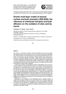 We present a novel kinetic multi-layer model that explicitly resolves mass transport and chemical reaction at the surface and in the bulk of aerosol particles (KM-SUB). The model is based on the PRA framework of gas–particle interactions (P¨oschl et al., 5 2007), and it includes reversible adsorption, surface reactions and surface-bulk exchange as well as bulk diffusion and reaction. Unlike earlier models, KM-SUB does not require simplifying assumptions about steady-state conditions and radial mixing. The temporal evolution and concentration profiles of volatile and non-volatile species at the gas-particle interface and in the particle bulk can be modeled along with surface 10 concentrations and gas uptake coefficients. In this study we explore and exemplify the effects of bulk diffusion on the rate of reactive gas uptake for a simple reference system, the ozonolysis of oleic acid particles, in comparison to experimental data and earlier model studies. We demonstrate how KM-SUB can be used to interpret and analyze experimental data from laboratory stud15 ies, and how the results can be extrapolated to atmospheric conditions. In particular, we show how interfacial transport and bulk transport, i.e., surface accommodation, bulk accommodation and bulk diffusion, influence the kinetics of the chemical reaction. Sensitivity studies suggest that in fine air particulate matter oleic acid and compounds with similar reactivity against ozone (C=C double bonds) can reach chemical lifetimes of 20 multiple hours only if they are embedded in a (semi-)solid matrix with very low diffusion coefficients (10−10 cm2 s−1). Depending on the complexity of the investigated system, unlimited numbers of volatile and non-volatile species and chemical reactions can be flexibly added and treated with KM-SUB. We propose and intend to pursue the application of KM-SUB 25 as a basis for the development of a detailed master mechanism of aerosol chemistry as well as for the derivation of simplified but realistic parameterizations for large-scale atmospheric and climate models.