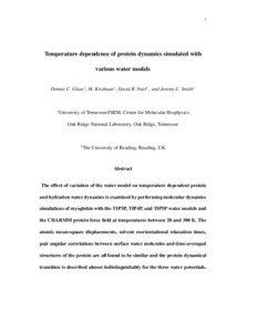 Glass, D. C., Krishnan, M., Nutt, D. R. and Smith, J. C. (2010) Temperature dependence of protein dynamics simulated with three different water models. Journal of Chemical Theory and Computation, 6 (4). pp. 1390-1400. ISSN 1549-9618 doi: 10.1021/ct9006508