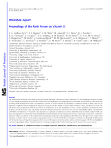 Lanham-New, S. A., Buttriss, J. L., Miles, L. M., Ashwell, M., Berry, J. L., Boucher, B. J., Cashman, K. D., Cooper, C., Darling, A. L., Francis, R. M., Fraser, W. D., de Groot, C. P. G. M., Hyppönen, E., Kiely, M., Lamberg-Allardt, C., Macdonald, H. M., Martineau, A. R., Masud, T., Mavroeidi, A., Nowson, C., Prentice, A., Stone, E. M., Reddy, S., Vieth, R. and Williams, C. M. (2011) Proceedings of the Rank Forum on Vitamin D. British Journal of Nutrition, 105 (1). pp. 144-156. ISSN 0007-1145 doi: 10.1017/S0007114510002576