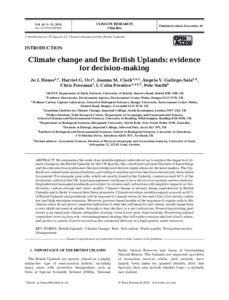 We summarise the work of an interdisciplinary network set up to explore the impacts of climate change in the British Uplands. In this CR Special, the contributors present the state of knowledge and this introduction synthesises this knowledge and derives implications for decision makers. The Uplands are valued semi-natural habitats, providing ecosystem services that have historically been taken for granted. For example, peat soils, which are mostly found in the Uplands, contain around 50% of the terrestrial carbon in the UK. Land management continues to be a driver of ecosystem service delivery. Degraded and managed peatlands are subject to erosion and carbon loss with negative impacts on biodiversity, carbon storage and water quality. Climate change is already being experienced in British Uplands and is likely to exacerbate these pressures. Climate envelope models suggest as much as 50% of British Uplands and peatlands will be exposed to climate stress by the end of the 21st century under low and high emissions scenarios. However, process-based models of the response of organic soils to this climate stress do not give a consistent indication of what this will mean for soil carbon: results range from a very slight increase in uptake, through a clear decline, to a net carbon loss. Preserving existing peat stocks is an important climate mitigation strategy, even if new peat stops forming. Preserving upland vegetation cover is a key win–win management strategy that will reduce erosion and loss of soil carbon, and protect a variety of services such as the continued delivery of a high quality water resource.