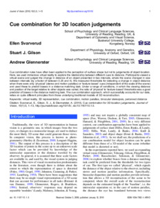 Svarverud, E., Gilson, S. J. and Glennerster, A. ORCID: https://orcid.org/0000-0002-8674-2763 (2010) Cue combination for 3D location judgements. Journal of Vision, 10 (5). pp. 1-13. ISSN 1534-7362 doi: 10.1167/10.1.5