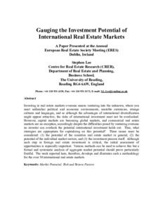 Lee, S. L., (2005) Gauging the investment potential of international real estate markets. Working Papers in Real Estate & Planning. 19/05. Working Paper. University of Reading, Reading. pp18.