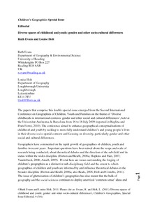 Evans, R. ORCID: https://orcid.org/0000-0002-4599-5270 and Holt, L. (2011) Diverse spaces of childhood and youth: gender and other socio-cultural differences. Children's Geographies, 9 (3-4). pp. 277-284. ISSN 1473-3277 doi: 10.1080/14733285.2011.595902