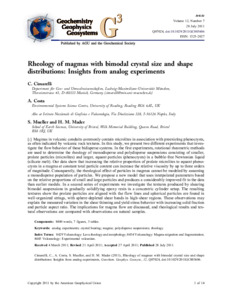Cimarelli, C., Costa, A., Mueller, S. and Mader, H. M. (2011) Rheology of magmas with bimodal crystal size and shape distributions: insights from analog experiments. Geochemistry, Geophysics, Geosystems, 12 (7). Q07024. ISSN 1525-2027 doi: 10.1029/2011GC003606