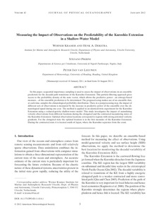In this paper sequential importance sampling is used to assess the impact of observations on a ensemble prediction for the decadal path transitions of the Kuroshio Extension (KE). This particle filtering approach gives access to the probability density of the state vector, which allows us to determine the predictive power — an entropy based measure — of the ensemble prediction. The proposed set-up makes use of an ensemble that, at each time, samples the climatological probability distribution. Then, in a post-processing step, the impact of different sets of observations is measured by the increase in predictive power of the ensemble over the climatological signal during one-year. The method is applied in an identical-twin experiment for the Kuroshio Extension using a reduced-gravity shallow water model. We investigate the impact of assimilating velocity observations from different locations during the elongated and the contracted meandering state of the KE. Optimal observations location correspond to regions with strong potential vorticity gradients. For the elongated state the optimal location is in the first meander of the KE. During the contracted state of the KE it is located south of Japan, where the Kuroshio separates from the coast.
