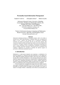Gulliver, S. ORCID: https://orcid.org/0000-0002-4503-5448, Ghinea, G. and Grzybek, H. (2009) Personality based information management. In: 11th ICISO (IFIP WG8.1 Working Conference): Information systems in the changing era: theory & practice, 11-12 Apr 2009, Beijing, China, pp. 94-99.