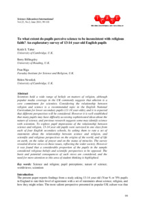 Taber, K., Billingsley, B., Riga, F. and Newdick, H. (2011) To what extent do pupils perceive science to be inconsistent with religious faith? An exploratory survey of 13-14 year-old English pupils. Science Education International, 22 (2). pp. 99-118. ISSN 2077-2327